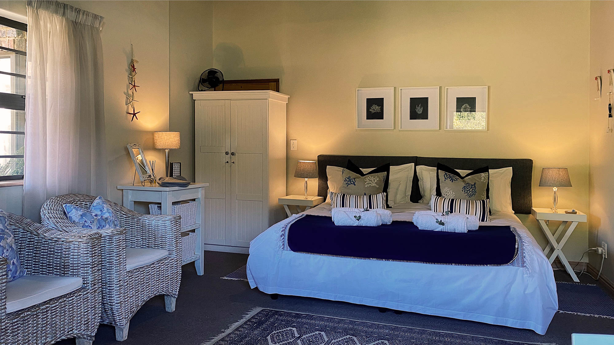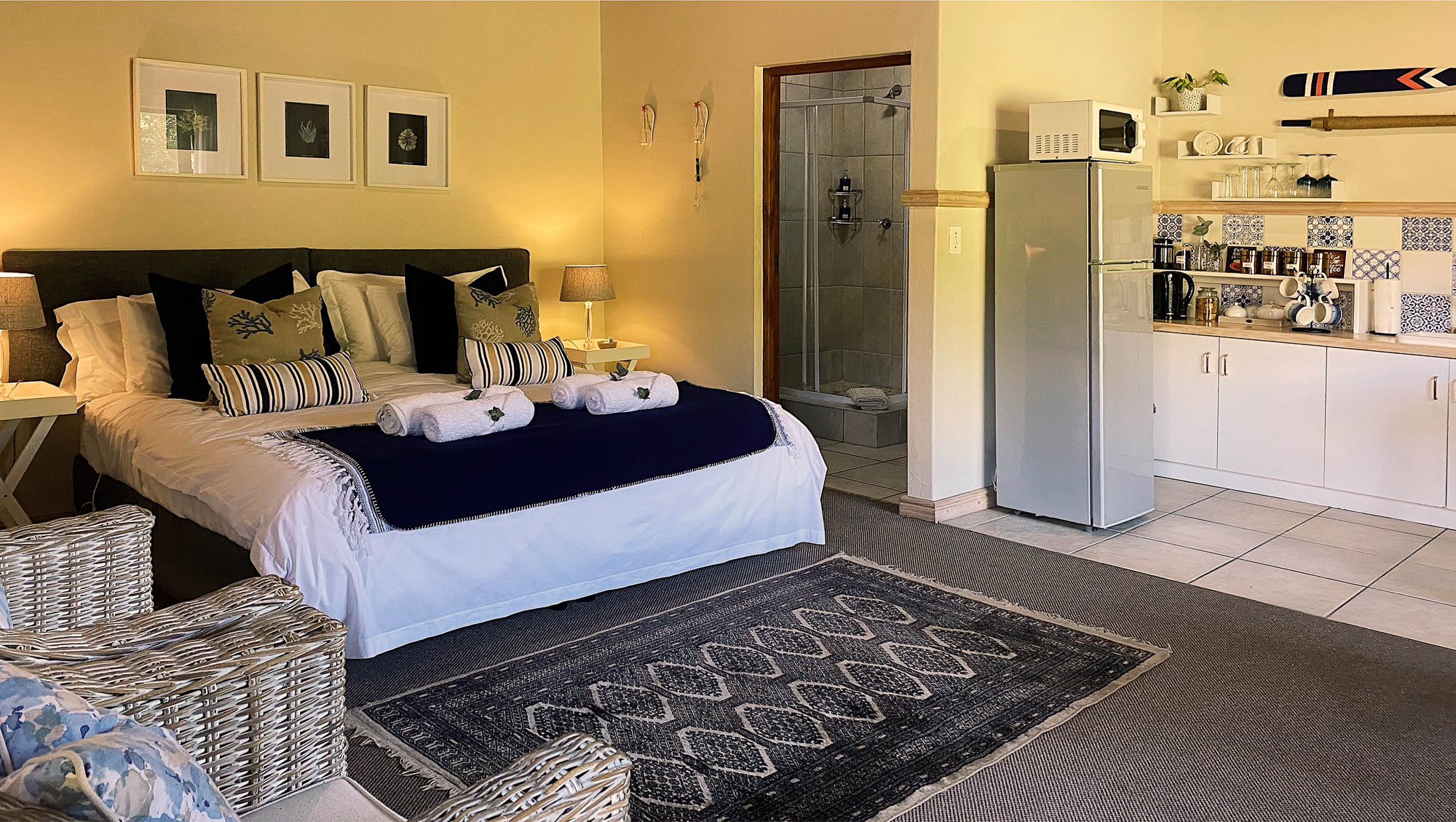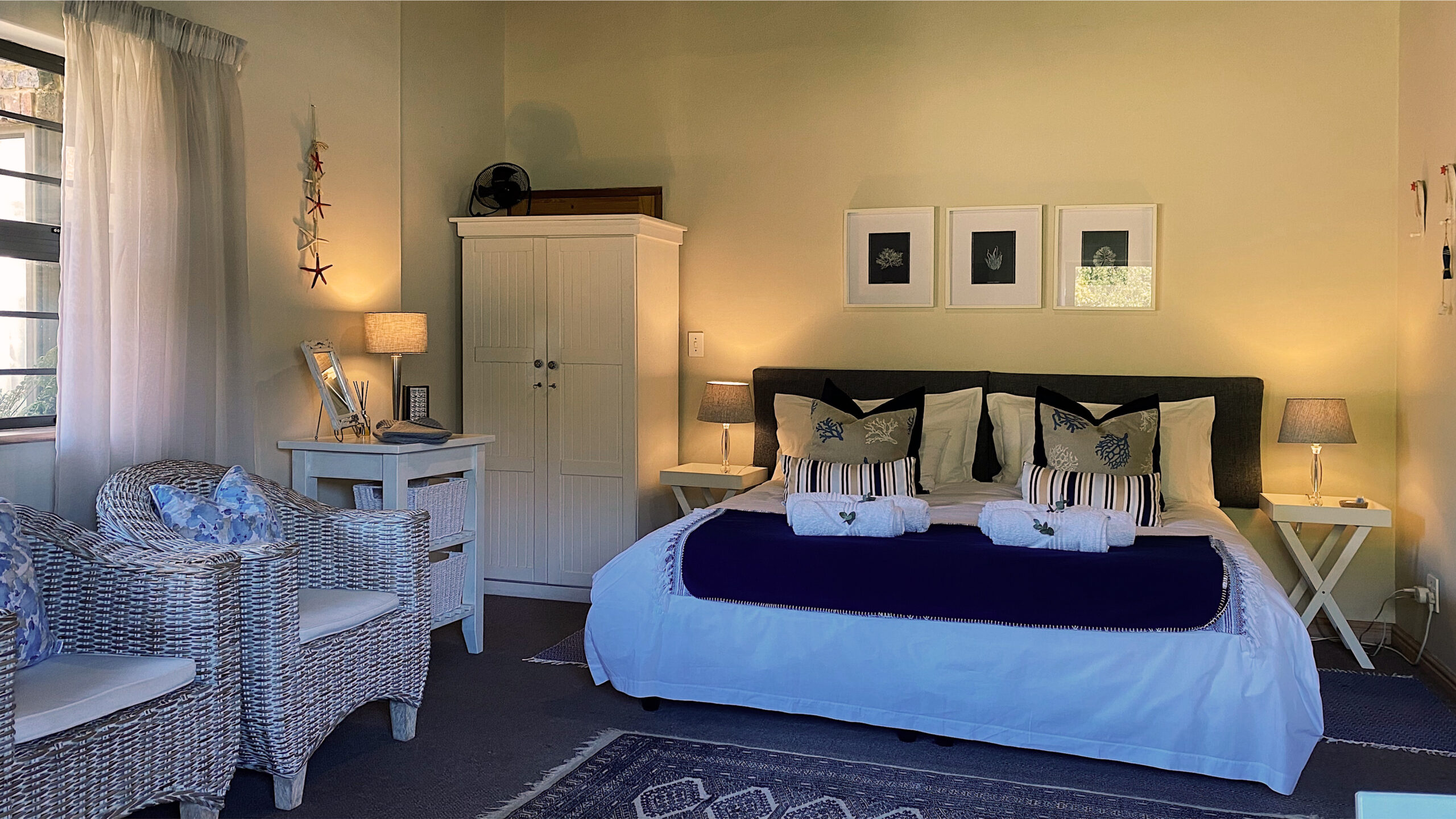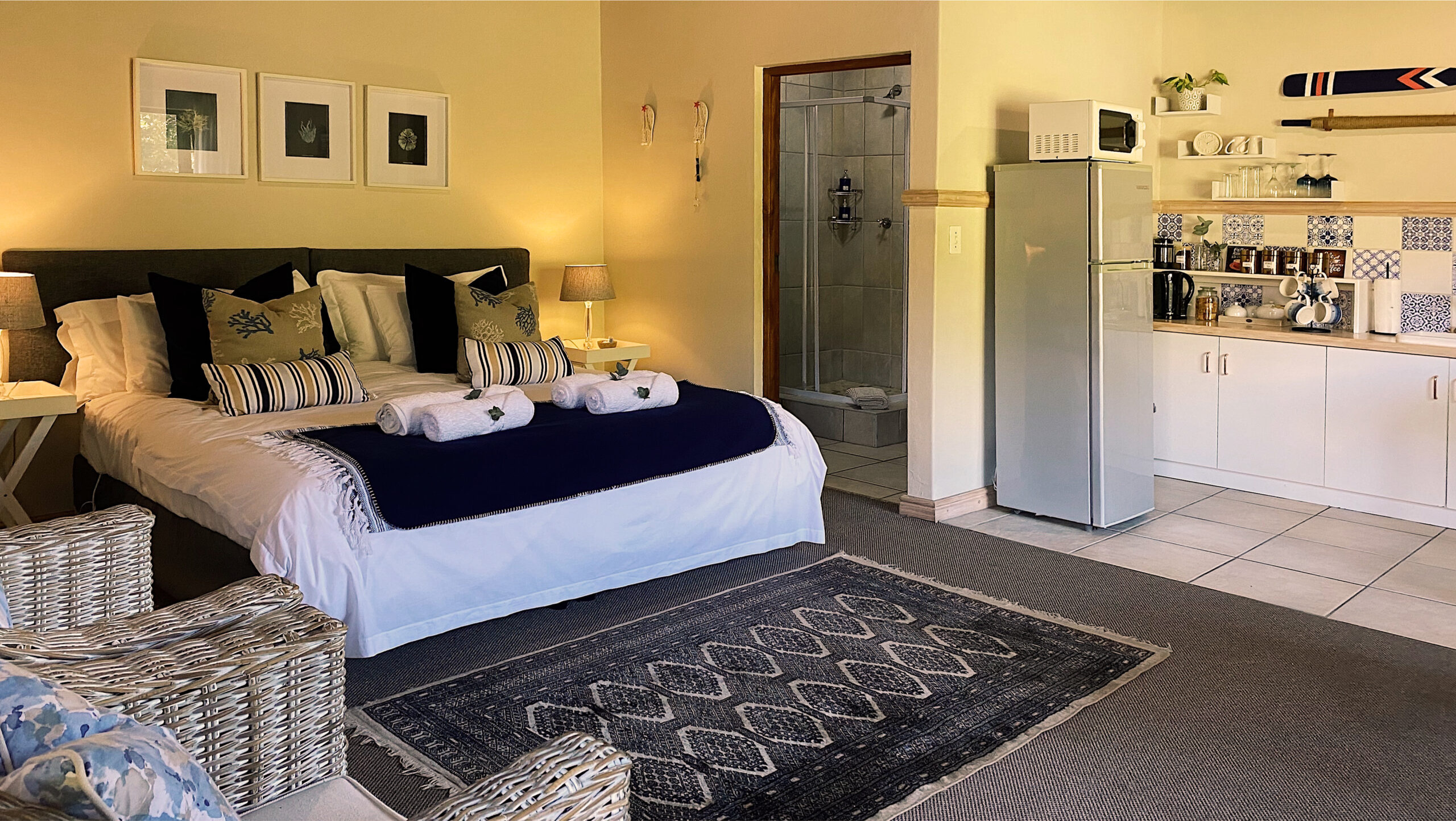 Adjacent to the main house, yet private and with its own entrance, this suite has a king-sized bed which can also be made up into singles, upon request. This coastal themed room has an intimate indoor eating area as well as a BBQ area which overlooks the garden and pool.